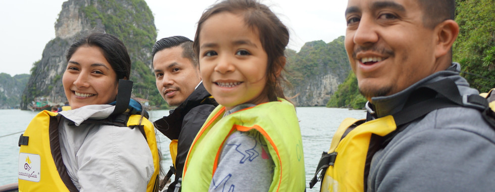 Day 8-10: Ha Long Bay - In the morning we watched another water puppet show and then drove to the bay. We booked our three day all inclusive cruise through Indochina Junk and boarded a beautiful ship with lounge chairs on the top deck and each cabin had fantastic views of the bay. On the first day I went kayaking with our friends while Angel stayed on the boat with Addie. I had gotten stuck in a current and strong wind while kayaking and had to get rescued by our guide. We went to the closest cruise ship for them to help me off my kayak and onto the guide’s kayak and he brought me back to our cruise ship. We were all offered kayaking on the second day but the water was even choppier so nobody wanted to do it. Instead those who wanted to jumped in for a swim. It was freezing cold so I wasn't interested but Angel did it! We then took a tender to a remote beach for more cave exploration and a shoreline lunch. We also visited a pearl farm and a floating fishing village! Addie made friends with other kids on the boat so It was nice having little breaks here and there to just relax.
